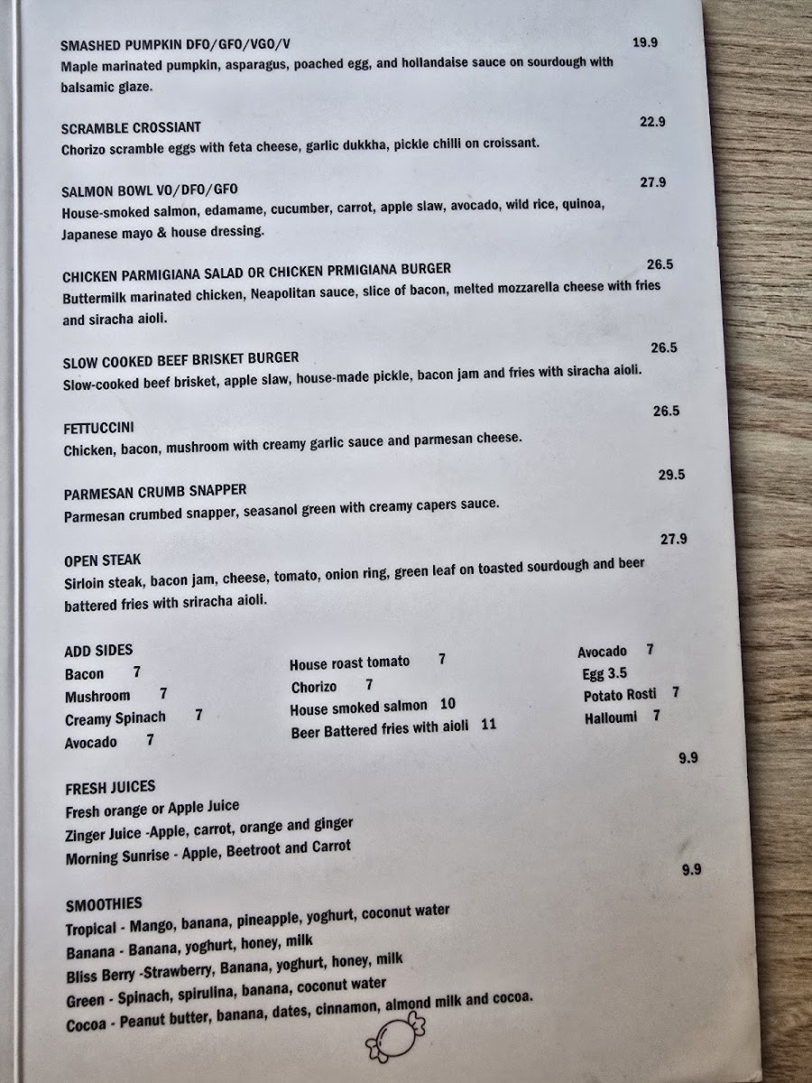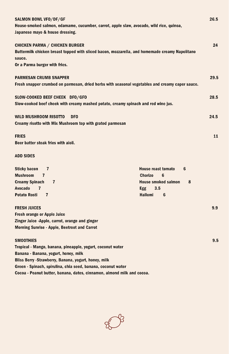 Meals comprise a range of dishes, with highlighted items such as Shakshuka Egg, Candy Benny, Smashed Pumpkin, Risotto, and the Parma Chicken Burger. There are also options catering to children, including Onesie, Kids Bacon and Cheese Toastie, Kids French Toast, and Kids Chicken Nuggets.