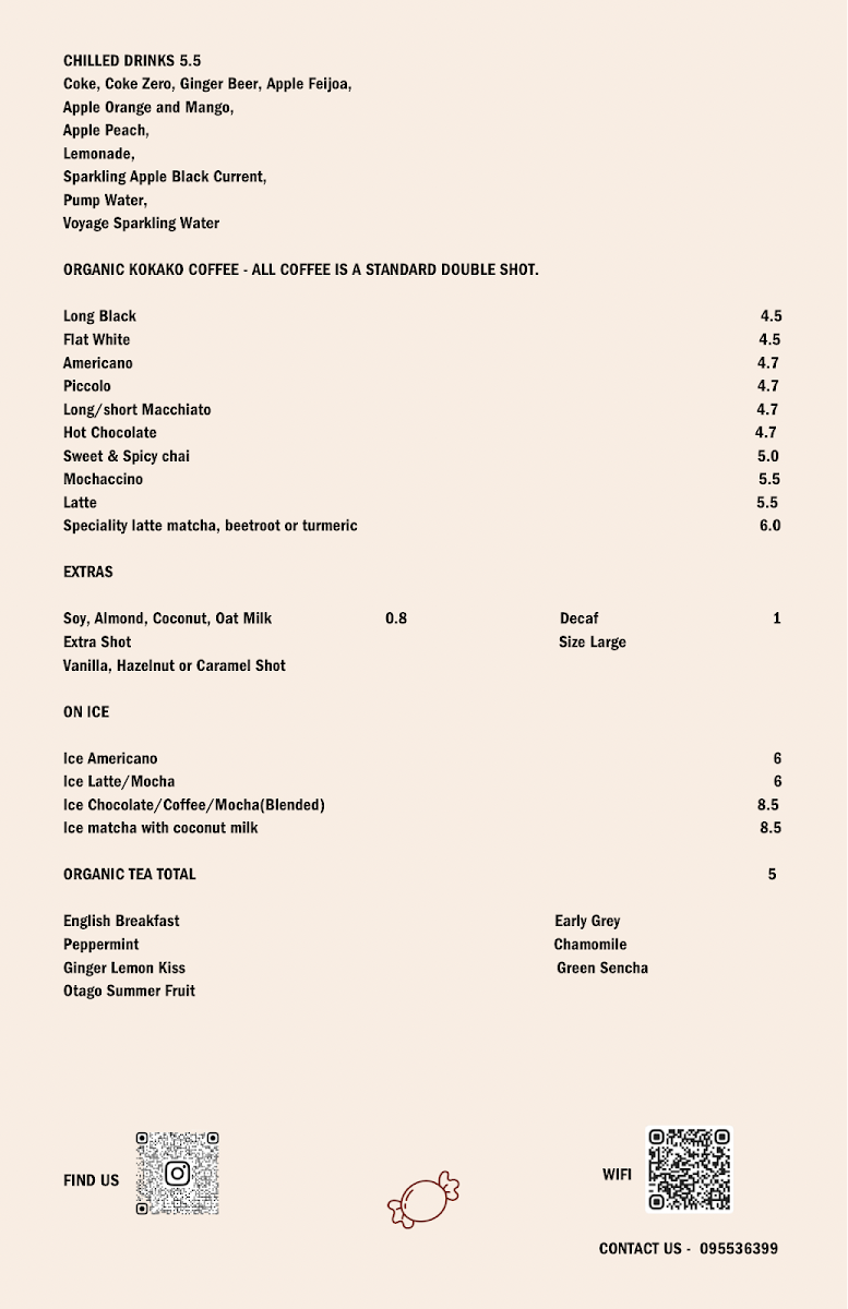 Beverages include a selection of organic Kokako coffee drinks such as Long Black, Americano, Flat White, Cappuccino, Piccolo, Hot Chocolate, Sweet & Spicy Chai, Mochaccino, and Latte. Specialty lattes are also available with unique flavors like Matcha, Beetroot, and Turmeric. For cooler options, iced drinks include Iced Americano, Iced Latte, Iced Chocolate, Iced Matcha, and Iced Strawberry Matcha.